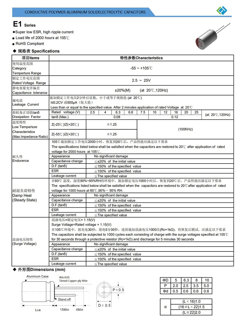● Super low ESR, high ripple current ● Load life of 2000 hours at 105℃ ● RoHS Compliant